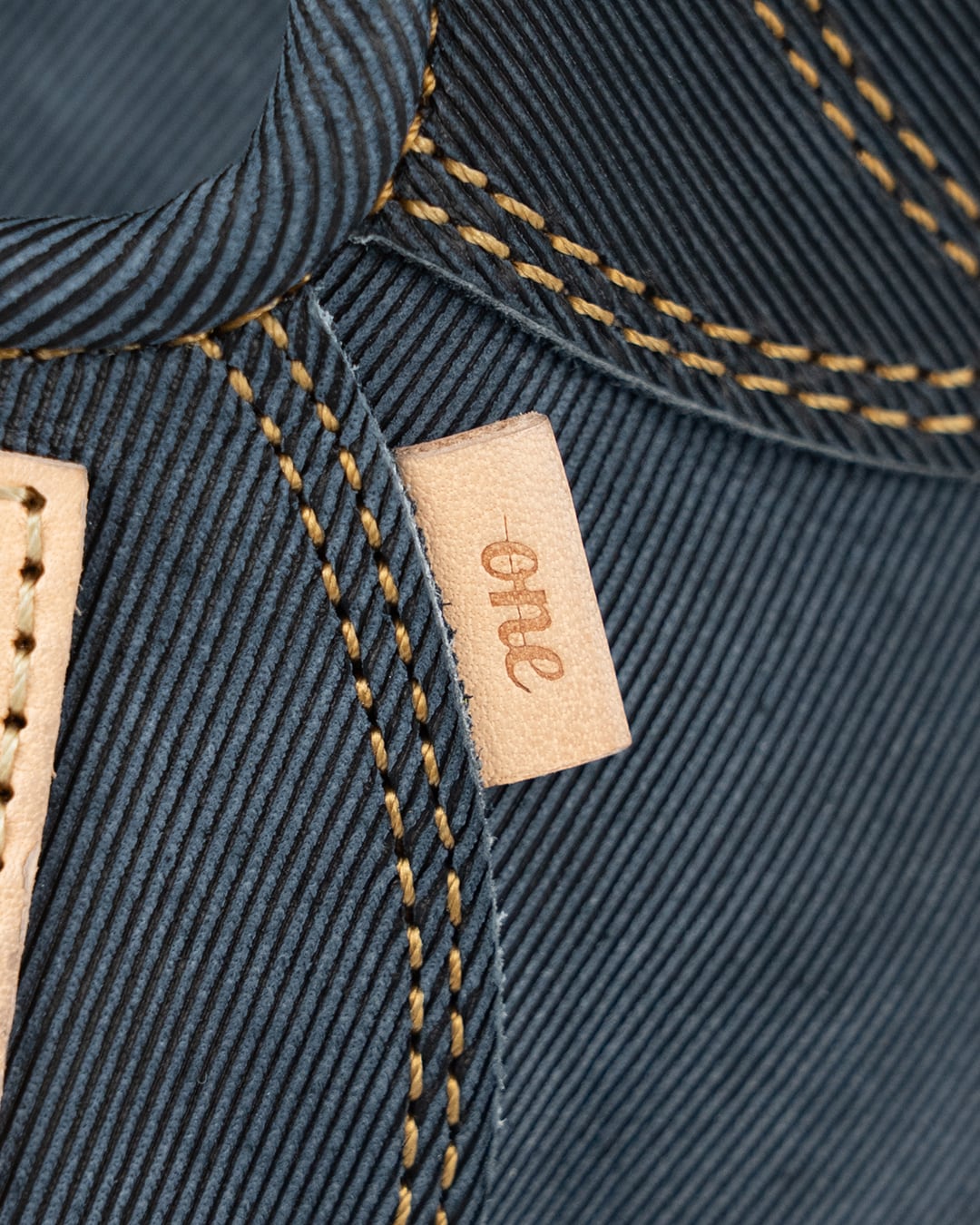 デニム調レザー特有の織りとツヤが、角度や光で微妙に表情を変える。