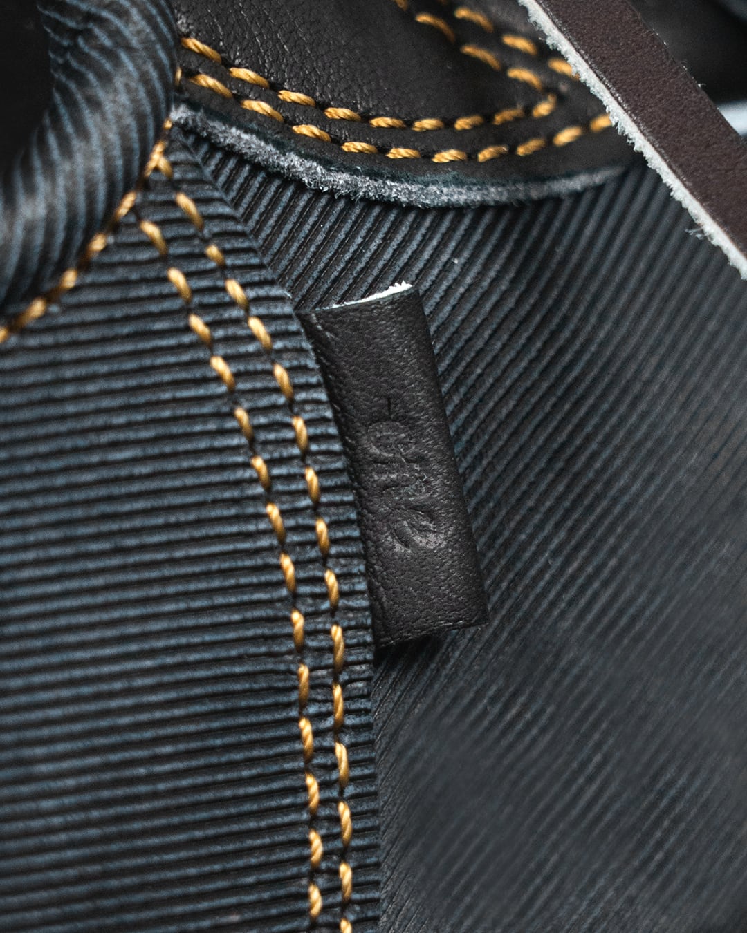 デニム調レザー特有の織りとツヤが、角度や光で微妙に表情を変える。